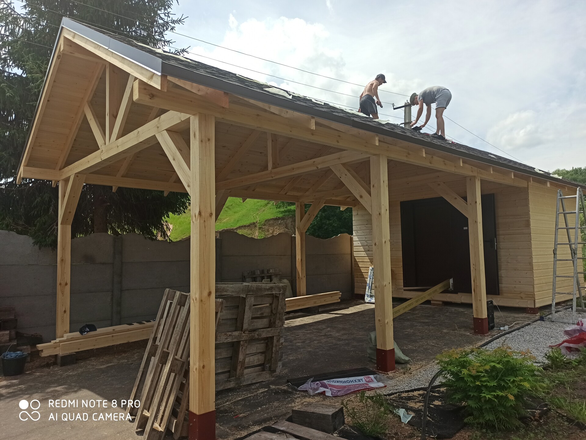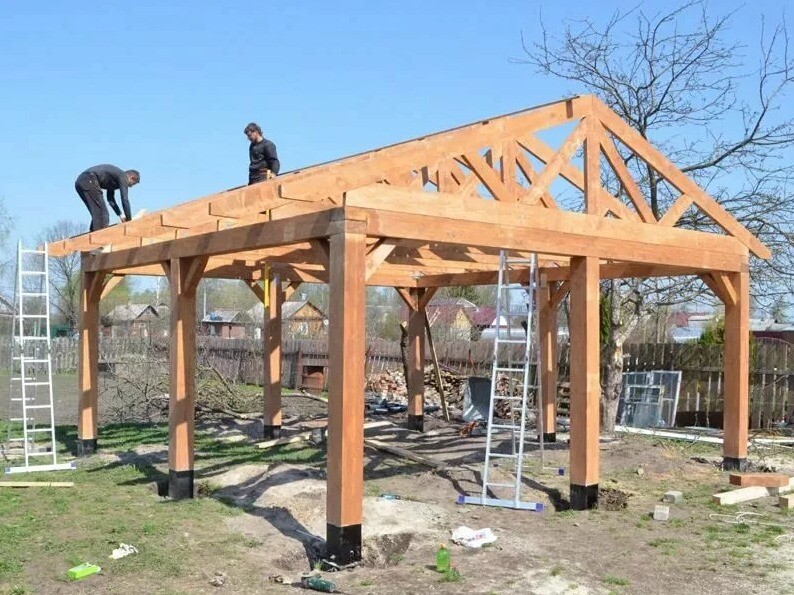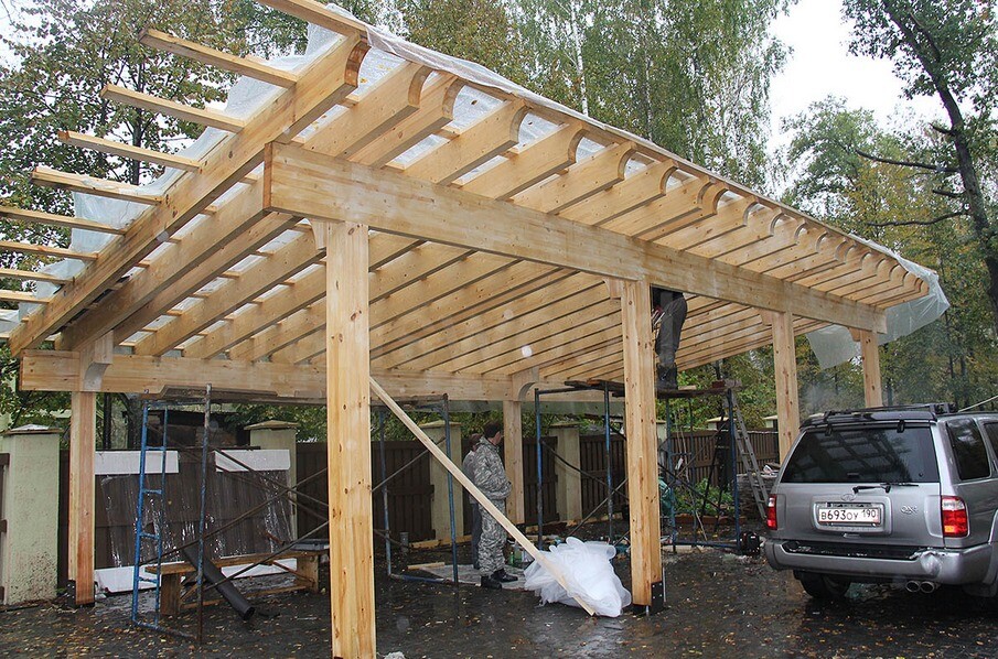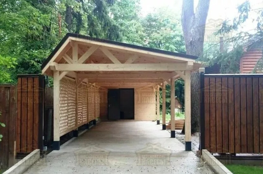 Деревянный навес на две машины 5х5 м с двухскатной кровлей